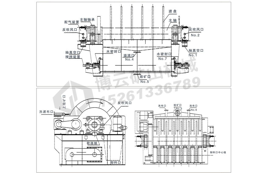 連云港博云礦山機(jī)械生產(chǎn)的PG系列盤式真空過濾機(jī) (1)扇形濾板脫水孔分布均勻,孔率合理,筋條尺寸大,由高強(qiáng)度工程塑料制成,壽命提高了2-3倍。 (2)濾液管過濾數(shù)面大,分配頭腹腔容積大,提高了抽氣率和濾液排放效果。 (3)耐磨錦綸、單或復(fù)絲濾布使脫餅率高且不易堵塞,使用壽命長。 (4)多點(diǎn)干油泵集中多點(diǎn)自動潤滑。 (5)濾布自動清洗裝置,保持了其良好的脫水效果。 (6)臥式強(qiáng)制高速攪拌、軸端采用橡膠及石墨盤根和水壓差三重密封不漏漿。 (7)主傳動無級變速,依物料的濃度及流量調(diào)節(jié)(交流調(diào)速電機(jī)或變頻器),以求達(dá)到理想的工作效果 。 (8)每盤由20片扇形板組成,加強(qiáng)了過濾過程控制,成餅厚度均勻。 (9)磨擦片采用特制耐磨硼鑄鐵,剛?cè)嵯酀?jì)密封佳,使用壽命達(dá)到十年以上。 (10)濾液管為高強(qiáng)度耐磨陶瓷復(fù)合鋼管,提高壽命10倍以上。 (11)濾液管與濾扇接口去掉下法蘭,采取模具定位直接焊接,減少了90%可能的漏氣點(diǎn)。