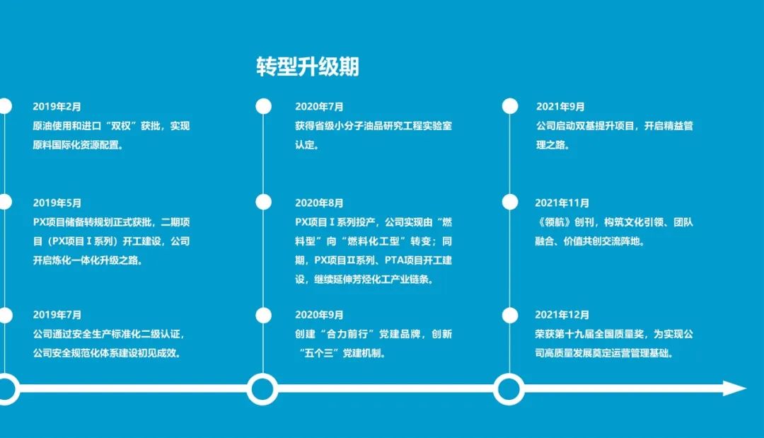 公司實施煉化一體化轉型戰略,秉承競合共生發展理念,整合產業資源,協同構建研發—油氣開采—煉化生產—倉儲物流—大宗化工品/化工新材料一體化產業鏈條,引入國際先進的UOP、 SHELL、BP、 TOPSOE等專利技術,先后建成440萬噸/年連續重整I系列、200萬噸/年對二甲苯I系列等10余套裝置及配套設施,II系列連續重整、對二甲苯裝置和250萬噸/年PTA裝置將于2022年投產,實現由“燃料型”向“燃料化工型”企業轉型,全力打造平安、綠色、智能、開放、盡責的煉化一體化平臺。