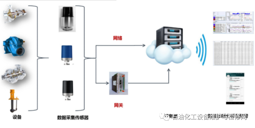 在機(jī)泵上安裝便攜式傳感器,用來(lái)采集相應(yīng)數(shù)據(jù)(如:軸承溫度、泵振動(dòng)值等),傳感器可以采用有限或無(wú)線智能傳感器,近幾年無(wú)線傳感器技術(shù)已相對(duì)成熟,無(wú)線傳感器具有安裝便捷、快速等特點(diǎn),結(jié)合設(shè)備的重要性和安裝條件,可以綜合考慮無(wú)線傳感器與有線傳感器來(lái)實(shí)現(xiàn)數(shù)據(jù)采集。