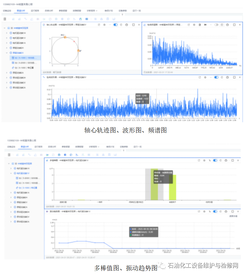 對(duì)采集的數(shù)據(jù)(軸承溫度、泵振動(dòng)等)進(jìn)行分析,得到變化圖譜,以振動(dòng)為例,主要對(duì)收集的數(shù)據(jù)進(jìn)一步轉(zhuǎn)化成波形圖和頻譜圖進(jìn)行分析,得到具體引起振動(dòng)的原因,有針對(duì)性的提前采取預(yù)防措施。