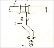 差壓式流量計(jì)在化工生產(chǎn)中得到最廣泛的應(yīng)用,也是操作人員最為熟悉的一種流量計(jì),它的節(jié)流裝置(1)安裝在生產(chǎn)工藝管道(2)上,并由引壓管(3)和差壓變送器(4)三個(gè)部分組成流量測量系統(tǒng)(如圖1所示)。