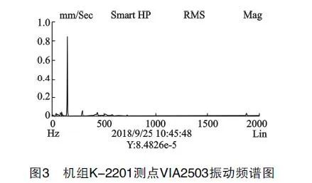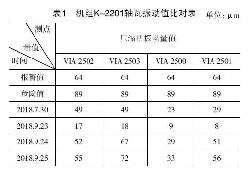 富氣壓縮機(jī)K-2201在2018年9月23日大檢修后第一次開機(jī)運(yùn)行,機(jī)組軸系各部振動(dòng)均在正常范圍內(nèi),各軸瓦振動(dòng)值均不超過20μmm,檢修情況良好。