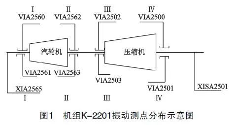 根據(jù)結(jié)構(gòu)與振動(dòng)測(cè)點(diǎn)分布,如圖1,利用西安交通大學(xué)的RotVIEW9.0富氣壓縮機(jī)組K-2201的振動(dòng)數(shù)據(jù)進(jìn)行采集,采用Enpac2500數(shù)據(jù)采集器及E原monitor V3.7分析軟件。