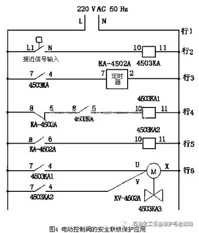 1.2電動控制閥的安全聯鎖保護電動控制閥的電動執行器是以220V交流單項電源作為驅動電源,接受來自調節器的毫安信號或電壓控制信號來進行工作的。現在國內的電動控制閥大多采用進口的日本工裝電子式電動執行器,電子式控制單元常被設計成黑匣子形式,并用樹脂澆鑄,驅動電機采用交流可逆電機,可以正驅動或反驅動;驅動量的反饋檢測采用高性能的、高可靠性的電位器,以實現控制調節功能。切斷或調節電動控制閥的安全聯鎖保護歸根結底是通過安全聯鎖信號對驅動電機的驅動電源的控制,以實現驅動電機的正轉或反轉,來達到對控制閥的打開或關閉的目的。因此只要將安全聯鎖信號作為接點信號接人電動控制閥的電源控制回路中,當安全聯鎖信號動作時,也就是接點信號動作,使得正驅動電源或反驅動電源接通,實現控制閥的打開或關閉。圖4所示為電動控制閥較復雜的安全聯鎖保護接線圖,通過接入定時器聯鎖控制電動控制閥的打開和關閉。在圖4行2中,引入安全聯鎖保護接點信號,接點閉合時,繼電器4503KA線圈得電,行3中4503KA常開接點7-4閉合,定時器KA-4502A開始計時,行4中4503KA常開接點8-5閉合,繼電器4503KA1線圈得電,行6中4503KA1常開接點7-4閉合,電動控制閥4503KA3正轉,閥門打開;當定時器KA-4502A計時到設定值時,其觸點動作,行4中定時器KA-4502A常聞接點8-5打開,繼電器4503KA1線圈失電,行6中4503KA1常開接點7-4打開,電動控制閥4503KA3正轉失電,同時行5中KA-4502A觸點8-6閉合,繼電器4503KA2線圈得電,行6中4503KA2常開接點7-4閉合,電動控制閥4503KA3反轉得電,閥門關閉。
