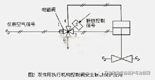 1.1.2雙作用執行機構控制閥安全聯鎖保護雙作用氣動控制閥使用彈簧復位或無彈簧執行機構,安全聯鎖動作時關閉或打開控制閥。其應用如圖2所示。