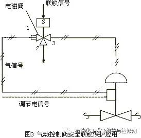 1.1.3氣動控制閥安全聯鎖保護氣動控制閥用于安全聯鎖動作時,在氣源信號線上增加電磁閥,電磁閥的配氣由I/P閥門定位器調節,安全聯鎖動作時,關閉或打開控制閥。其應用如圖3所示。