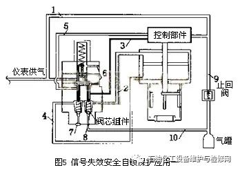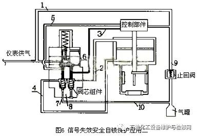 2.1.1信號失效氣動控制閥全開或全關安全保護在圖5中,1號管路為儀表供氣管路,2號管路為給氣缸頂部壓力的管路,3號管路為給氣缸頂部控制壓力的管路,4號管路為給氣缸底部壓力的管路,5號管路為給氣缸底部控制壓力的管路,6號為鎖定部件上下膜片來回運動的排氣口,7號為儲氣罐提供給氣缸底部的供氣口,8號為儲氣罐提供給氣缸頂部的供氣口,9號管路為儲氣罐提供給控制部件供氣壓力的管路,10號管路為儲氣罐提供給氣缸頂部或底部供氣壓力的管路。