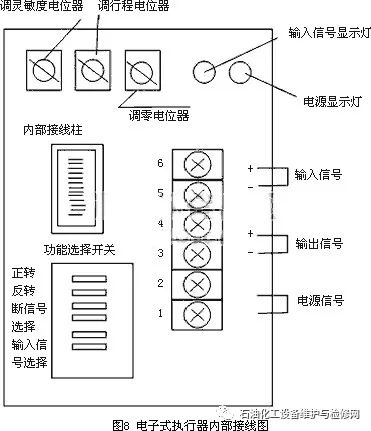 在以上的信號失效控制閥安全保護示意圖中,止回閥在信號失效時,會保證儲氣罐的儲氣壓力輸送到氣缸的頂部、底部或頂部和底部。當供氣壓力恢復到正常時,止回閥恢復到原來的位置,以保證儲氣罐充滿所需要的氣壓,以備下次信號失效時繼續發揮它的作用。2.2信號失效電動控制閥的安全保護電動控制閥的關鍵部件在于其內部樹脂澆鑄的控制器,其接受來自調節器的毫安或電壓信號和來自開度檢測器的開度信號,將兩信號相比較并放大,向消除其差值的方向驅動和控制電機,其結果是使得來自調節器信號和開度信號之間的偏差被減小,當偏差消除時控制部分令電機停止在該位置上,達到調節和控制的目的。當信號失效時,輸出軸在相應的時間內仍處于運轉狀態,如果沒有相應的控制措施,會停留在某一個位置,而失去對電動控制閥的安全保護。根據工藝過程的需要,在電動控制閥的設計選型和安裝過程中,就應該注意到信號失效時電動控制閥的安全保護。在圖8電動控制閥電子式執行器內部接線圖中,信號失效時根據工藝過程的需要使閥門開度仍然處于信號失效前的位置時,將圖中的3和4斷開,接通5,就可以使輸出軸停止在原位置,使閥門開度保持不變。
