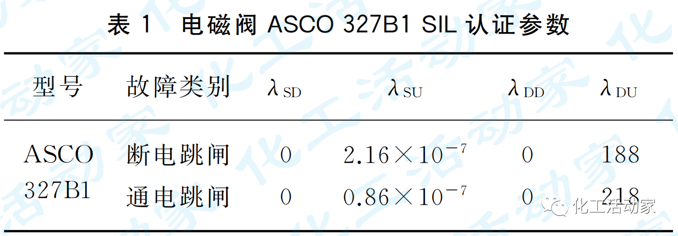 控制閥承擔(dān)安全功能時(shí)基本都會(huì)采用電磁閥來(lái)設(shè)計(jì)氣路,氣路附件包含過(guò)濾減壓閥、電磁閥、氣控閥、放大器等,而電磁閥是電氣轉(zhuǎn)換的關(guān)鍵部件。為保障裝置安全電磁閥一般按故障安全型設(shè)計(jì),即電磁閥設(shè)計(jì)成正常得電勵(lì)磁、失電聯(lián)鎖的方式。電磁閥ASCO 327B1 SIL認(rèn)證參數(shù)見(jiàn)表1所列,按斷電跳閘來(lái)說(shuō)安全失效分?jǐn)?shù)(SFF)為53.46%,按通電跳閘來(lái)說(shuō)SFF為28.28%,SFF數(shù)值越大安全性越高。