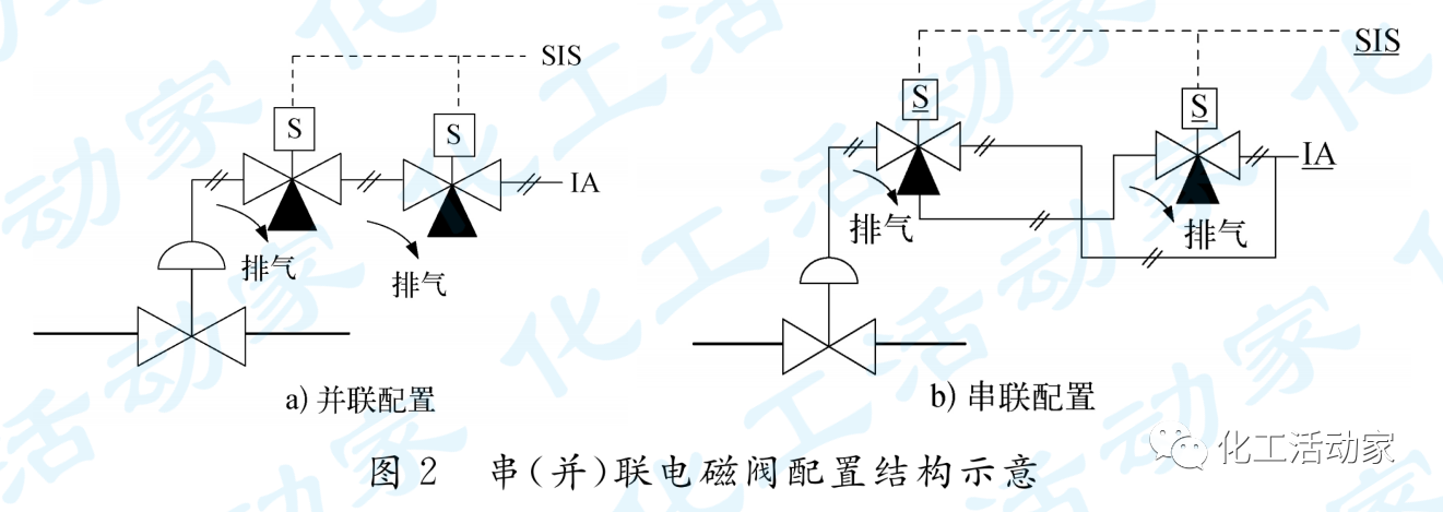 串(并)聯(lián)配置是指雙電磁閥的配置結(jié)構(gòu)形式,閥門(mén)聯(lián)鎖動(dòng)作時(shí)需要2臺(tái)電磁閥都失電的稱(chēng)串聯(lián),只需要其中任何1臺(tái)電磁閥失電就聯(lián)鎖動(dòng)作的稱(chēng)為并聯(lián),串(并)聯(lián)電磁閥兩種類(lèi)型配置結(jié)構(gòu)示意如圖2所示。