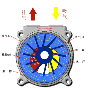 葉輪與泵殼成偏心,泵殼內充一定量的水,葉輪旋轉使水形成水環。相鄰葉片(如圖中紅色葉片)旋轉時,與水環形成的空間(氣室)變大即進氣,空氣(氣室)逐漸變小,即空氣被壓縮。多組相鄰葉片,即多組往復壓縮。結構緊湊、工作平衡可靠和流量均勻,所以化工生產中多用來輸送或抽吸易燃、易爆和有腐蝕性的氣體。水環式真空泵由于葉輪攪拌液體,損失能量大,故其效率很低。