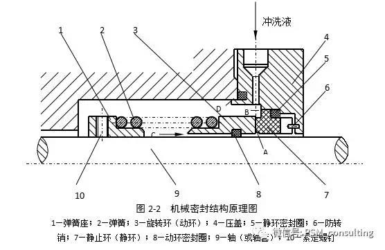 如圖2-3所示,單端面密封離心泵的軸封由一對摩擦副密封端面組成,只有一級密封,一般有自沖悉系統(tǒng),無外供液沖洗冷卻系統(tǒng),當(dāng)這一級密封泄漏時(shí),泵體介質(zhì)會直接泄漏到環(huán)境中,主要適用于一般介質(zhì)場合。與其他輔助密封并用時(shí),可用于帶懸浮顆粒、高溫、高壓等場合。