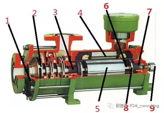 1.泵體 2.葉輪 3.前導(dǎo)軸承 4.定子 5.轉(zhuǎn)子 6.軸 7.后導(dǎo)軸承 8.推動(dòng)盤 9.軸承監(jiān)視器