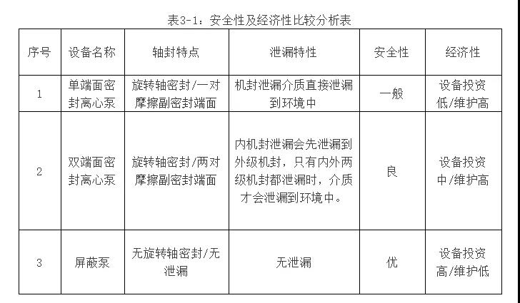 綜上所述,單端面密封離心泵、雙端面密封離心泵、屏蔽泵在輸送甲醇危險(xiǎn)物料時(shí),安全性及經(jīng)濟(jì)性比較如下表3-1所示: