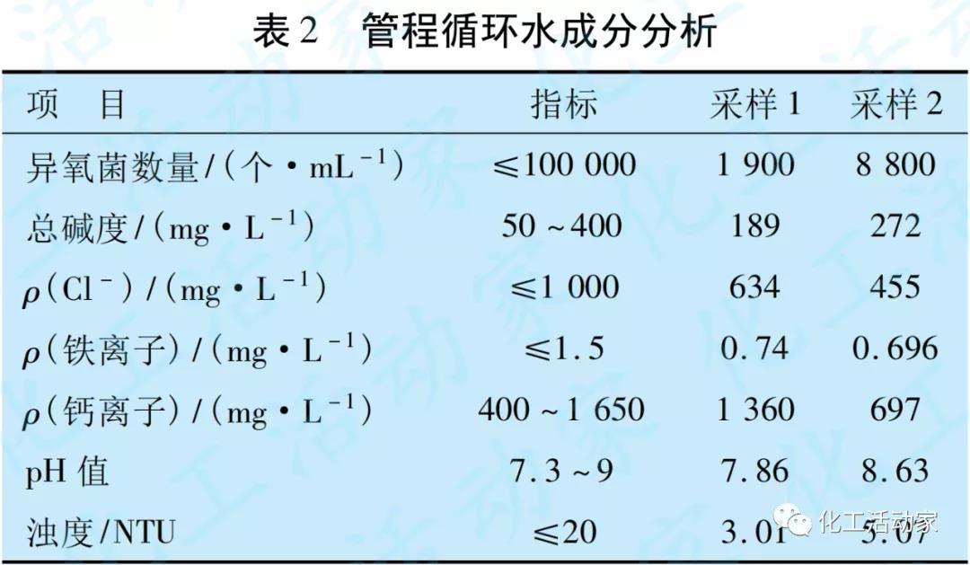 冷卻介質(zhì)為工業(yè)循環(huán)水,其中主要腐蝕成分為Cl-、微生物、溶解氧、生物黏泥及其他雜質(zhì)等。經(jīng)檢測(cè),循環(huán)水流速僅為0.2m/s,循環(huán)水流速低,管束易產(chǎn)生局部沉積,沉積物覆蓋在管束內(nèi)表面,導(dǎo)致細(xì)菌嚴(yán)重繁殖,加劇了垢下腐蝕。循環(huán)水指標(biāo)要求及成分見(jiàn)表2。