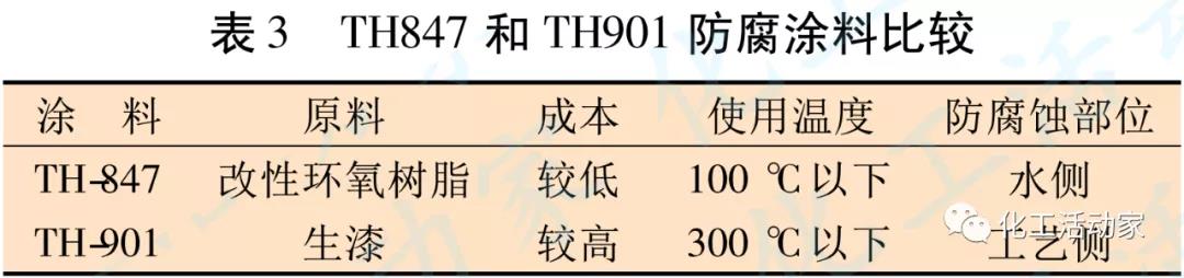 裝置水冷器管束內(nèi)表面使用TH-847防腐蝕涂料,TH-847是CH-784或7910水冷器專(zhuān)用涂料的改進(jìn)產(chǎn)品。20世紀(jì)90年代,我國(guó)又研制出耐溫性較好的TH-901/902防腐涂料,目前應(yīng)用較普遍,防腐后水冷器使用周期為3~5a。兩種TH系列涂料的比較見(jiàn)表3。