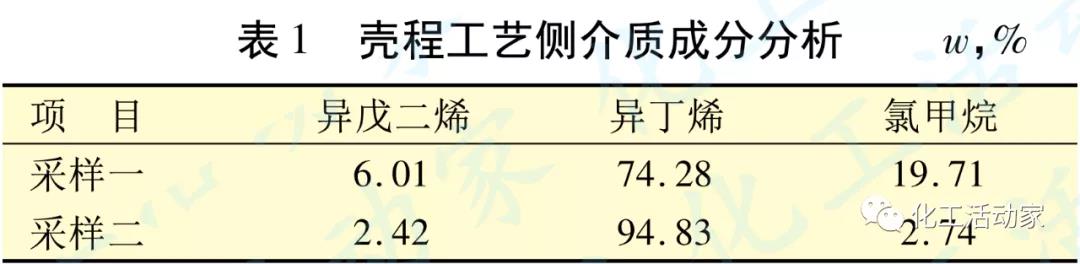 由于工藝原因,殼程介質(zhì)異丁烯中氯甲烷含量遠(yuǎn)超指標(biāo)要求(不超過(guò)300μg/g),具體數(shù)據(jù)見(jiàn)表1。