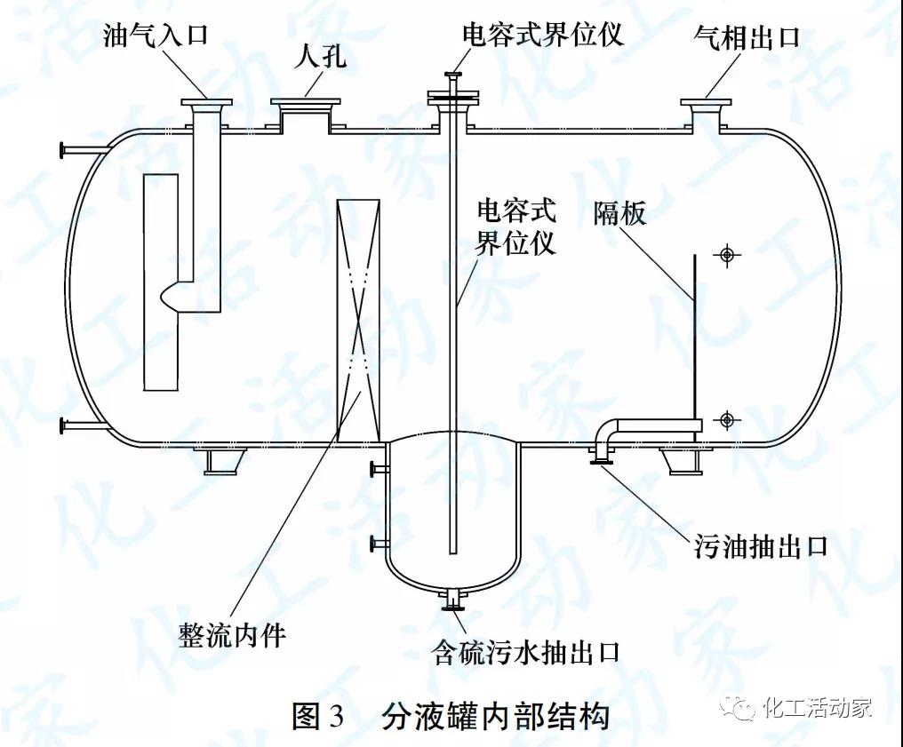 回流罐中增加強(qiáng)化油水分離內(nèi)件,主要是預(yù)分離設(shè)施、整流聚結(jié)設(shè)施、隔板、電容式界位儀等。通過擴(kuò)大水相區(qū)容積,提高污水的沉降時間,并進(jìn)行有效、準(zhǔn)確的檢測,改造后取得了較好的油水分離效果,且界位控制穩(wěn)定。分液罐內(nèi)件見圖3。