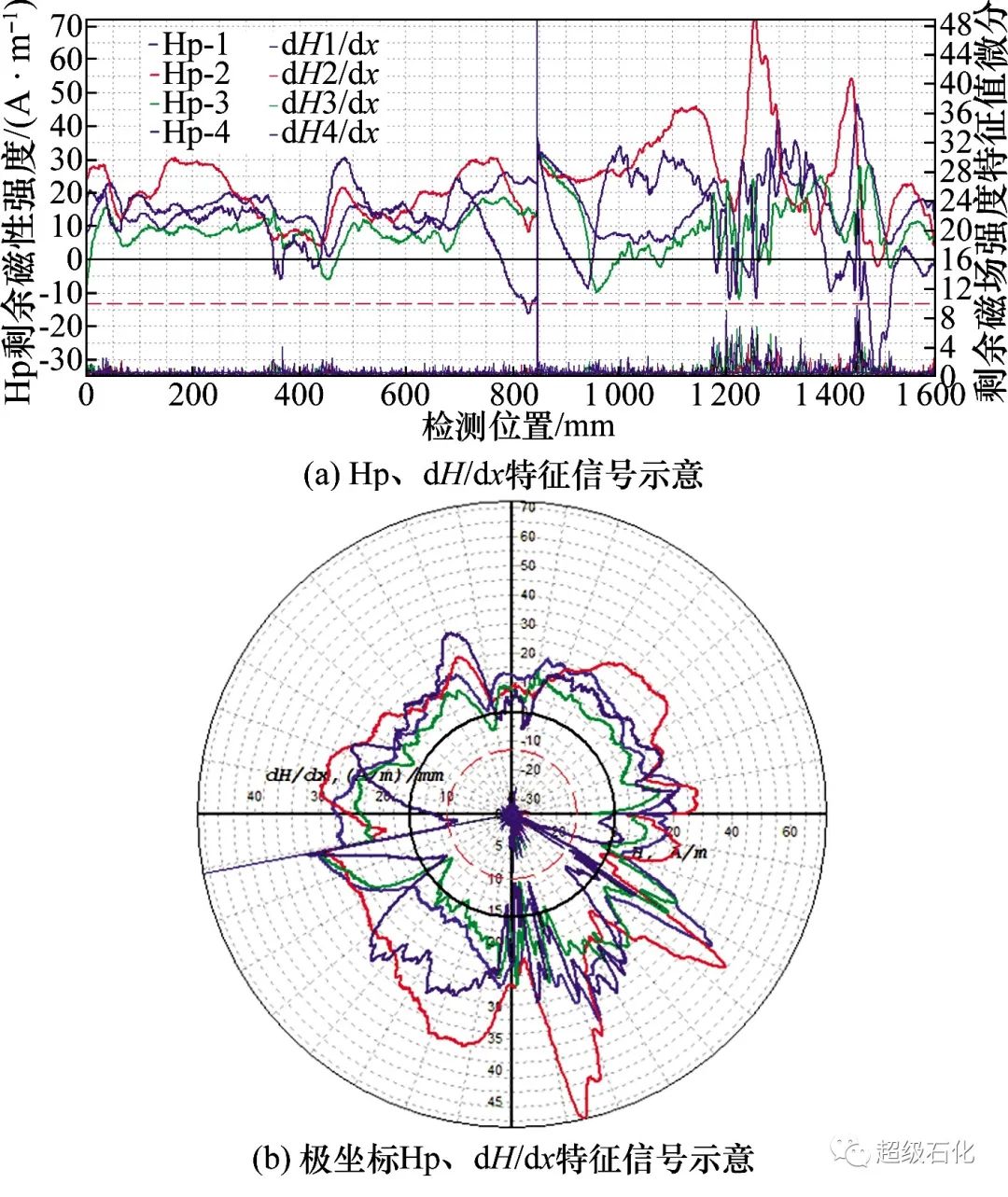 由圖4可以看出,在探頭位于1 300 mm的位置存在一處較為明顯的信號突變,即此處應存在應力集中區域;同時,結合觀察極坐標條件下的磁記憶信號可進一步判斷出該條被檢焊縫內部存在應力分布不均現象,可為后續監控、熱處理和修復等提供建議。