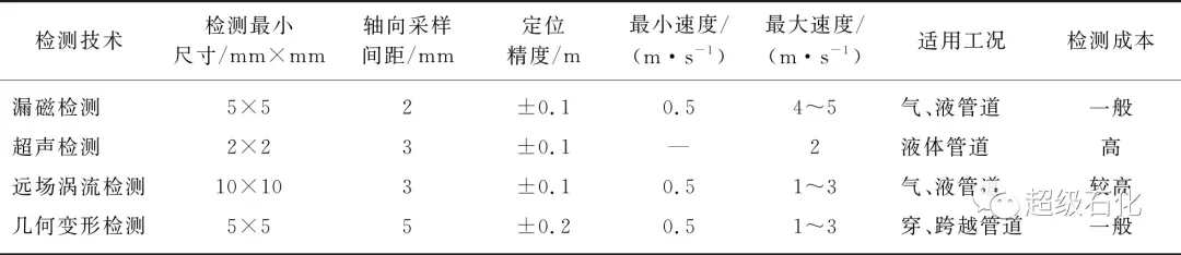 文獻[10]針對4種不同檢測技術的檢測最小尺寸、軸向采樣間距、定位精度、最小速度、最大速度、適用工況以及檢測成本等進行了總結,具體見表1所列。